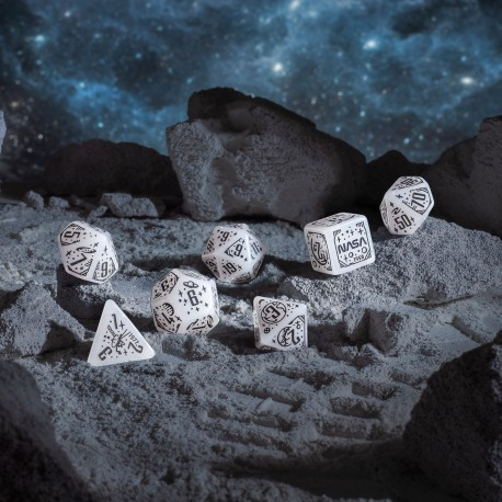Space awaits further exploration! This set commemorates groundbreaking events in space exploration, taking you on a journey full of incredible discoveries and achievements. Each of the seven dice is intricately crafted, with a white material infused with glitter dust and black embellishments, reminiscent of the view of the Milky Way through a telescope lens.